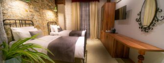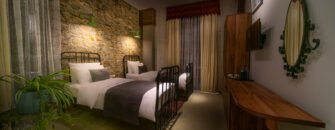 Carefully selected light-toned curtains showcase traditional local patterns, creating a harmonious and cozy atmosphere. The soft color palette and thoughtful design make this room especially comfortable and welcoming for longer stays.